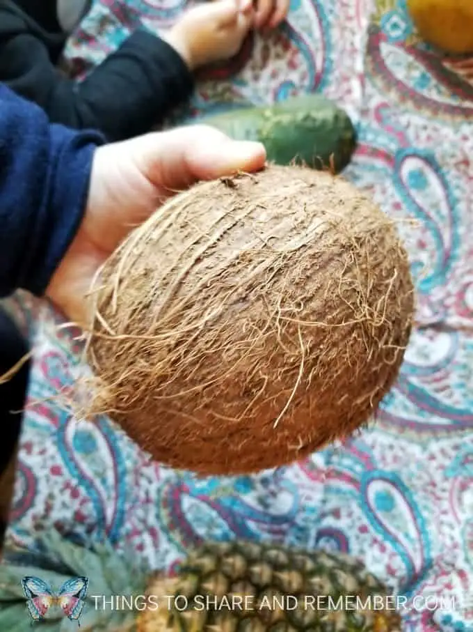 Coconuts are interesting to look at and hold. It has a rough texture and when you shake it, you can hear water inside! We don’t see coconuts very often in Wisconsin so the kids were anxious to see what’s on the inside.