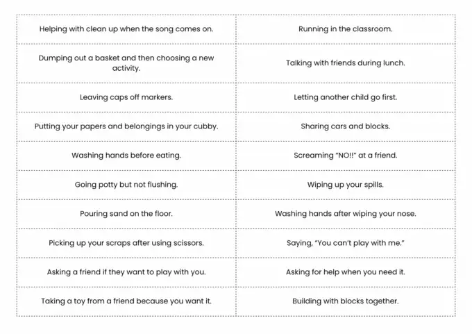 These statements address everyday classroom behaviors like sharing, hygiene, communication, and self-regulation. They also open the door for important social-emotional conversations.